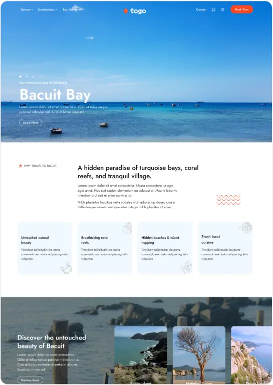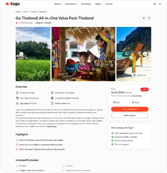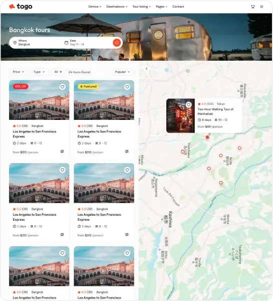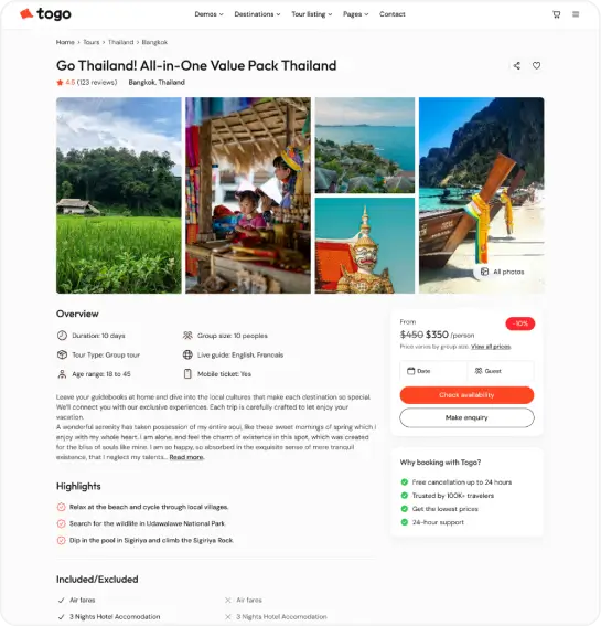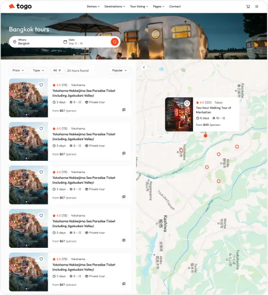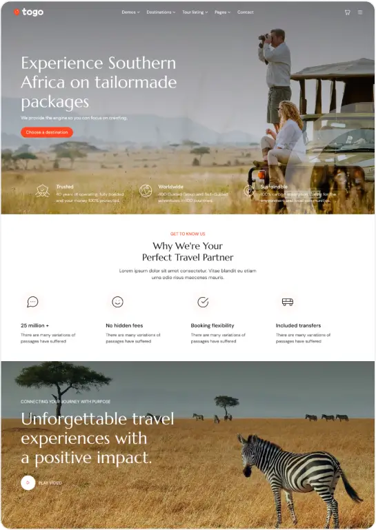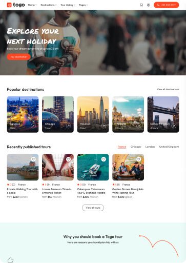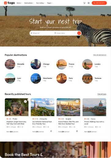 Togo is a professional WordPress theme that makes it easy to build a modern, beautiful tour booking website with full features for reservations, payments, and tour management.