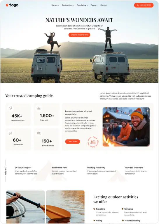 Togo – Travel & Tour Booking WordPress Theme is a modern and easy-to-use theme for travel agencies and tour operators. It offers powerful booking features, customizable itineraries, seasonal pricing, and WooCommerce support—perfect for creating a professional tour booking website.